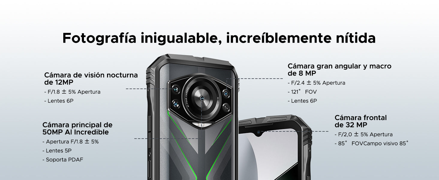 Con 50MP (cámara principal) + 20MP (visión nocturna) + 32MP (cámara frontal) + 8MP (gran angular y macro), puede capturar más detalles en su vida diaria y no perderse ni un momento, deja que este móvil impermeable sea tu buen ayudante. Equipado con 2 luces de flash y 2 luces IR, puede enfocar el sujeto fotografiado con mayor rapidez y precisión incluso en completa oscuridad, mejorando enormemente la claridad de las fotos.