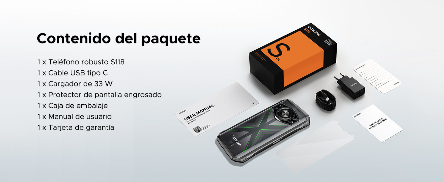 El moviles resistente 2024 con una 10800mAh gran batería puede satisfacer tus diferentes necesidades durante todo el día. El móvil libres S118 admite carga rápida C de 33 W y, con una carga completa, suele durar entre 3 y 5 días, con hasta 40 días en espera. Además DOOGEE S118 movil todoterreno tiene función OTG, que puede cargar otros aparatos eléctricos en caso de urgencia, por lo que es un dispositivo bueno y fiable para camping y senderismo.