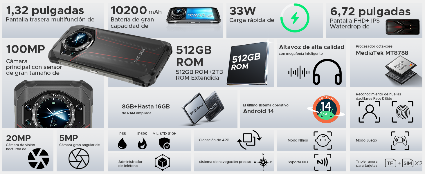 DOOGEE S119 Smartphone Android 14 con pantalla trasera inteligente, 24 GB + 512 GB, batería de 10200 mAh